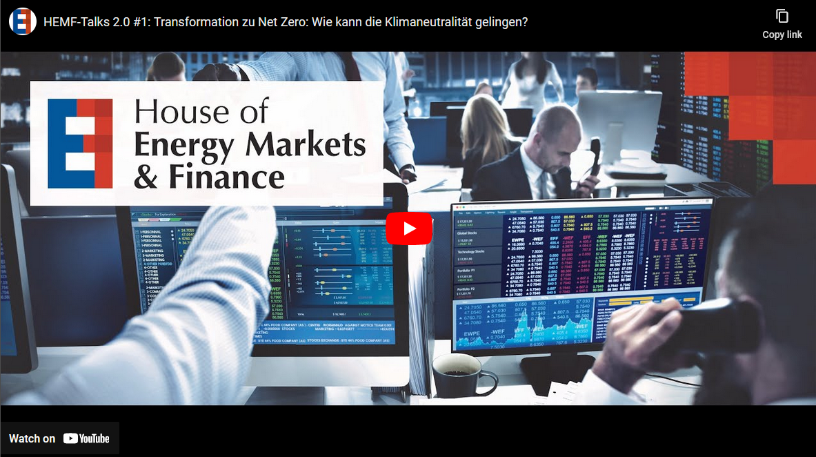 Das House of Energy Markets and Finance startete im Jahr 2021 eine neue Online-Veranstaltungsreihe: die HEMF Talks. Ziel der Reihe ist es, den gesellschaftlichen Diskurs zwischen Wissenschaft, Wirtschaft und Politik anzustoßen. Dieser fokussiert auf die Instrumente zur Erreichung der von Deutschland und der EU angestrebten Klimaneutralität und möchte hier zur gesellschaftlichen und politischen Meinungsbildung beitragen.